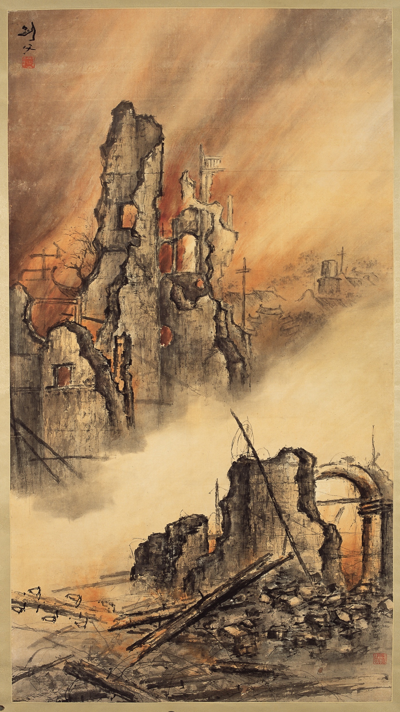 率先,通过构建抗战履行目的好意思术不雅,岭南好意思术完成了创作东旨的更新与题材的转型。二十世纪初,恰是中国好意思术表面纷呈动荡之时,而当民族危难莅临,好意思术家自发放下理念不合,和洽艺术阵线,将救国救民当作第一创作东旨,深广以战事、痛苦、醒悟、顽抗为题材的作品如狂潮深远。1932年“一·二八事变”爆发后,高剑父创作的国画《东战场的炎火》以写实目的笔法态状日军炸毁的上海东方藏书楼,在西方光影解决的烘托下,焦墨勾画的画面愈发肃肃豪壮。作品既以废地气候表达对干戈的控诉,更以屹立不倒的残碑饱读励公共勇毅顽抗。此画为较早介入抗战主题的岭南好意思术作品之一,说明注解了传统中国画在弘扬首要履行题材上的高大后劲与可塑性。