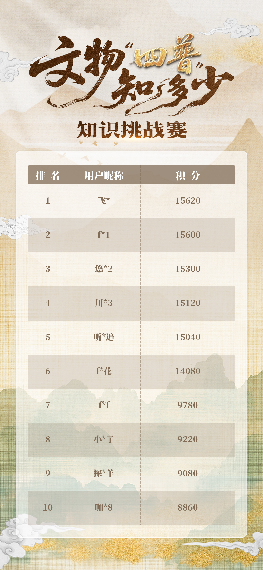 在兴致问答的方式,和普通的互动中,了解四川“四普”的最新音尘,感受东谈主类选藏的文物和历史文化遗产,擢升文物和文化遗产保护意志……跟着挑战赛落下帷幕,网友们在步履中得益了哪些“常识点”?又抽走了哪样重磅大奖呢?点进酬酢平台的热点话题#文物四普知些许#,就能看到三山五岳的网友在答题步履中,晓悟着中华地面上深厚的文物“家底”。