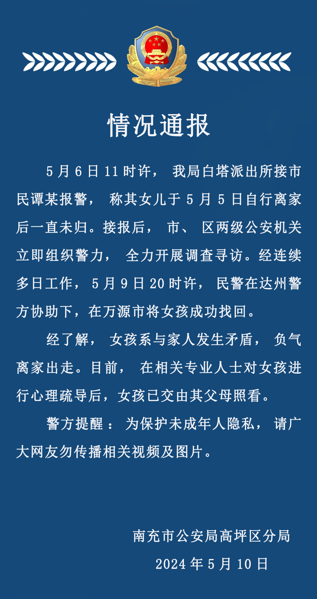 5月6日11时许,高坪区白塔派出所接市民谭某报警, 称其男儿于5月5日自行离家后一直未归。